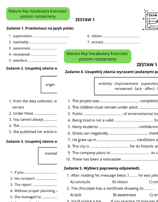 4 krótkie sprawdziany po 15 przykładów w każdym sprawdzianie. Łącznie 60 przykładów.